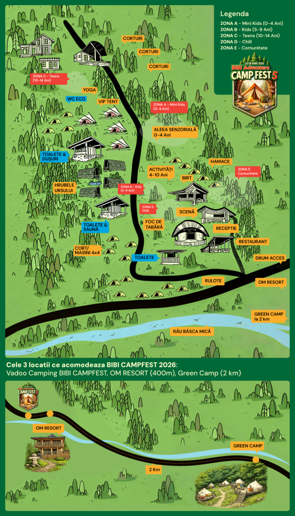 Anul 2026 este anul în care BIBI CAMPFEST ajunge la Ediția 5 – o ediție aniversară într-o nouă locație la Gura Teghii, la poalele munților Penteleu, cu râul Bâsca Mică aproape, unde continuăm o poveste ce aduce aproape întreaga familie prin natură, mișcare, socializare și joacă. BIBI ADVENTURE CAMPFEST este locul în care ai 4 zile pline de experiențe în mijlocul naturii, experiențe menite să te învețe cum să te deconectezi de task-uri, aglomerația orașelor, to do list-uri și să te reconectezi cu lucrurile ce dau sens și care sunt cu adevărat importante: familia, ritmul lent al zilelor în natură, cerul plin de stele, liniștea, umbra pădurilor și căldura gândului că echilibrul se contruiește pe valori simple, dar esențiale, de fapt cele care contează pentru a rămâne conectat cu tine.